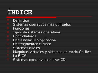 Este documento describe los sistemas operativos, incluyendo su definición como software que gestiona los recursos del ordenador, los tipos más utilizados como Windows y Linux, sus funciones principales como gestionar recursos y presentar interfaz de usuario, y conceptos como sistemas duales, máquinas virtuales, BIOS y sistemas en live-CD.