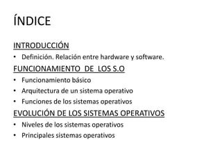 El documento habla sobre los sistemas operativos. Explica que un sistema operativo es el software más importante de una computadora y que maneja funciones básicas como reconocer el teclado y enviar información a la pantalla. También describe la evolución de sistemas operativos populares como Windows, Mac OS, Linux y cómo han ido mejorando sus funciones a través del tiempo.