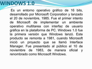 El documento resume las diferentes versiones de Windows, desde Windows 1.0 hasta Windows 2000. Explica las características clave y el año de lanzamiento de cada versión. También describe brevemente los cambios y mejoras introducidos en cada nueva versión del sistema operativo.