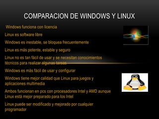 El documento compara tres sistemas operativos principales: Windows, Linux y MacOS. Windows es más fácil de usar pero menos estable, mientras que Linux es más potente y estable pero requiere más conocimientos técnicos. MacOS es más seguro contra virus pero las máquinas son más caras. Ambos sistemas tienen ventajas y desventajas dependiendo del uso previsto.