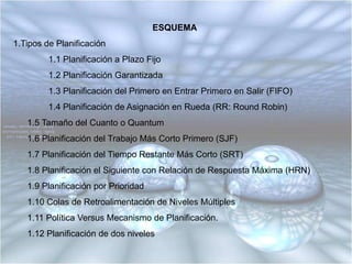 Este documento describe diferentes tipos de planificación de procesos y multiprocesamiento en sistemas operativos. Explica métodos como planificación a plazo fijo, garantizada, FIFO, Round Robin, más corto primero, prioridad, y de dos niveles. También cubre conceptos como multiprocesamiento, paralelismo, y distribución de ciclos para mejorar el rendimiento.