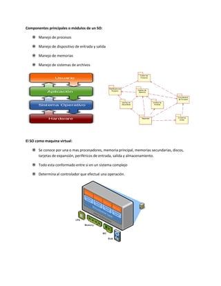 Un sistema operativo (SO) es un conjunto de programas que facilita la comunicación entre usuarios, hardware y software. Un SO maneja recursos como procesos, memoria, dispositivos de entrada/salida y archivos. Los SO se clasifican por su estructura (monolítica, jerárquica, cliente-servidor, máquina virtual), los servicios que ofrecen y cómo ofrecen esos servicios. Un SO debe satisfacer los requisitos tanto de los usuarios (facilidad de uso, seguridad) como del software (mantenimiento, operación de recursos, flexibilidad