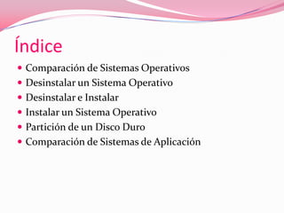 Este documento proporciona instrucciones sobre varios temas relacionados con sistemas operativos, incluida la desinstalación e instalación de sistemas operativos, la partición de discos duros y el mantenimiento preventivo y correctivo de computadoras. También incluye una sección de conclusiones que enfatiza que la calidad de un sistema operativo depende de sus características internas más que de su marca o empaque exterior.