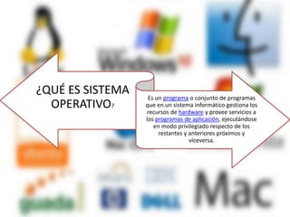 Este documento define qué es un sistema operativo y explica sus principales funciones y características. Un sistema operativo es un programa que gestiona los recursos de hardware y provee servicios a los programas de aplicación. Las funciones de un sistema operativo incluyen la gestión de memoria, procesador, ejecución de aplicaciones, entradas/salidas, archivos y autorizaciones. También describe diferentes tipos de sistemas operativos como monotarea, multitarea, monousuario y multiusuario. Por último, brinda información sobre el sistema operativo Solaris desarrollado