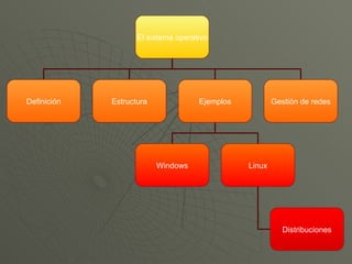 Este documento describe los sistemas operativos, incluyendo su definición, estructura y ejemplos como Windows, Linux y Android. Explica las características de accesibilidad y uso de Windows y Linux, así como las distribuciones de Linux. También cubre el Protocolo Simple de Administración de Redes y la característica de Virtual Wi-Fi en Windows.
