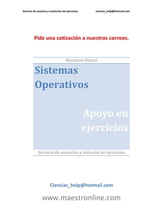 Este documento presenta una serie de ejercicios relacionados con sistemas operativos y componentes de computadoras. Incluye instrucciones para investigar conceptos como sistemas operativos, multiprogramación, multiprocesamiento y distribución de sistemas. También pide investigar componentes de hardware como CPU, memoria y discos. Finalmente, propone ejercicios prácticos sobre comunicación entre procesos y programación cliente-servidor.