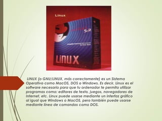 Linux es un sistema operativo libre como Windows o MacOS que permite ejecutar programas a través de interfaces gráficas o de línea de comandos. Permite multitarea, multiusuario y es compatible con múltiples plataformas.