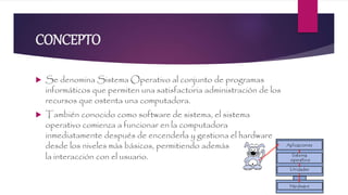 El documento habla sobre los sistemas operativos. Explica que un sistema operativo es un conjunto de programas que permiten administrar los recursos de una computadora y facilitan la interacción con el usuario. Luego enumera las cinco funciones básicas de un sistema operativo: administración de recursos, suministro de interfaz de usuario, administración de archivos, servicios de soporte y utilidades, y administración de tareas. Finalmente, menciona algunos de los sistemas operativos más populares para computadoras y teléfonos celulares.