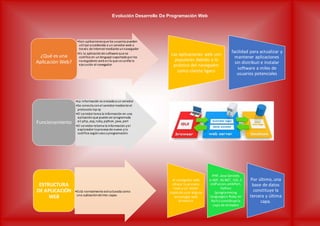 Las aplicaciones web son populares debido a que permiten actualizar y mantener aplicaciones sin distribuir e instalar software en miles de usuarios potenciales a través del navegador web. Existen varios lenguajes de programación para crear aplicaciones web como PHP, ASP, ASP.NET, JSP y Python, cada uno con ventajas y desventajas. El desarrollo de aplicaciones web permite publicar información dinámica almacenada en bases de datos.