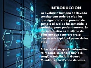 El documento analiza la evolución y funciones de los sistemas operativos, destacando su importancia en la gestión de recursos dentro de las computadoras desde sus inicios tras la II Guerra Mundial. Además, describe la memoria, procesadores, periféricos y clasificaciones de sistemas operativos que permiten la interconexión y uso eficiente de dispositivos. Concluye enfatizando cómo esta evolución ha facilitado la globalización y la comunicación en la sociedad actual.