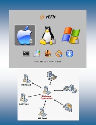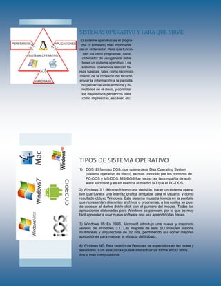 Este documento describe diferentes tipos de sistemas operativos, incluyendo DOS, Windows, Mac OS, y Unix. Explica brevemente las características y funciones de cada uno. También cubre propiedades deseables de los sistemas operativos como eficiencia, robustez, escalabilidad y seguridad.