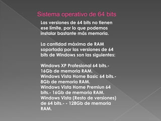 Para instalar un sistema operativo de 64 bits se requiere un procesador y placa base compatibles. Las versiones de 64 bits permiten instalar más memoria RAM que las de 32 bits, cuyo límite son 4GB. Aunque los sistemas de 64 bits ofrecen mayores prestaciones, para el usuario doméstico promedio no es necesario cambiar a una versión de 64 bits a menos que se necesite más de 3.5GB de RAM.