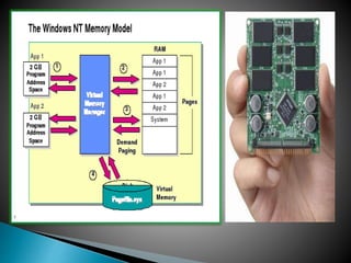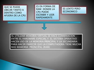 La memoria virtual es una técnica de administración de memoria que permite ejecutar procesos más allá de la memoria RAM física utilizando memoria secundaria como el disco duro. Utiliza una combinación de hardware especial y el sistema operativo para hacer que la computadora parezca tener más memoria principal de la que realmente tiene al mover páginas entre la memoria principal y secundaria.