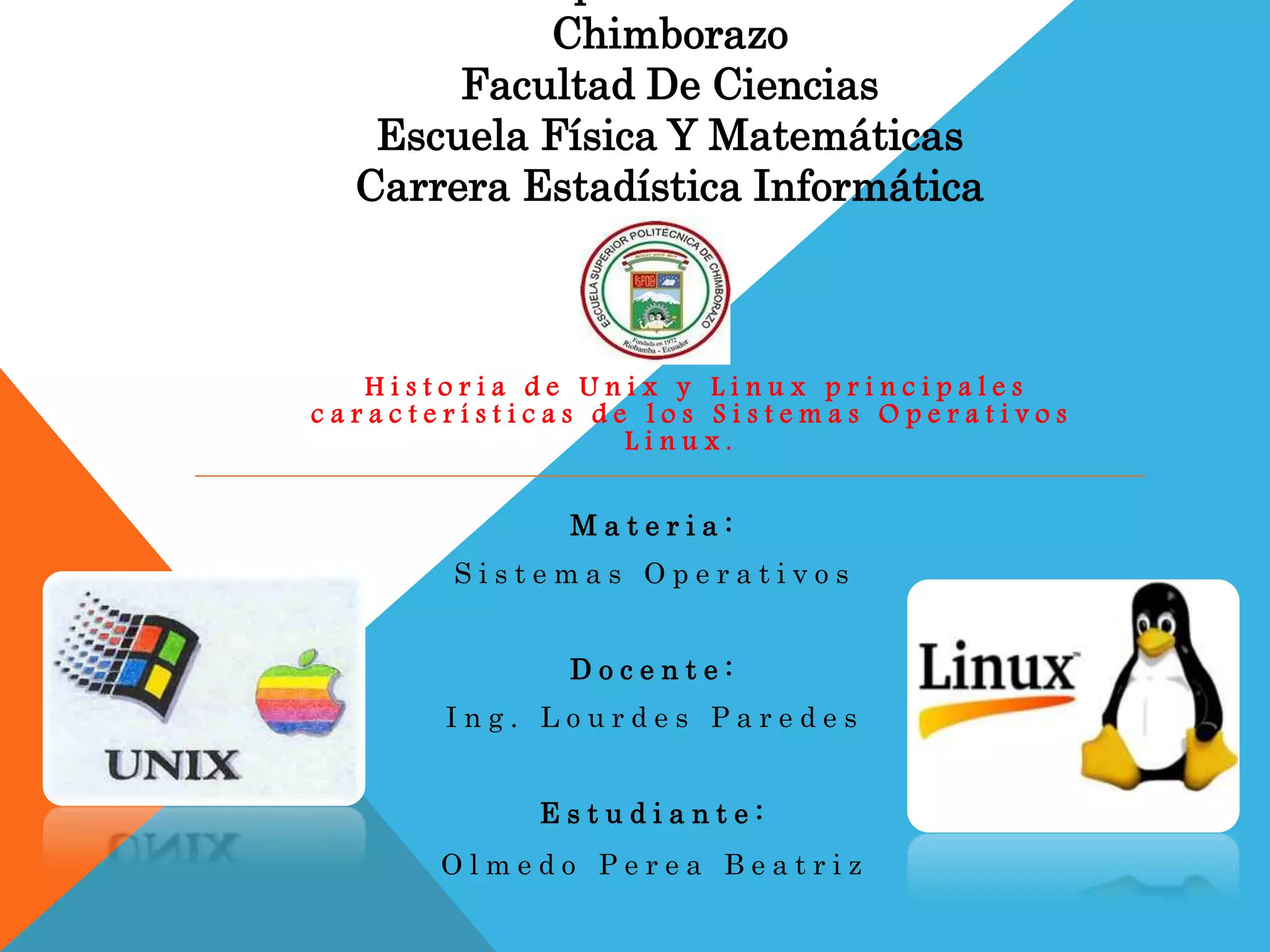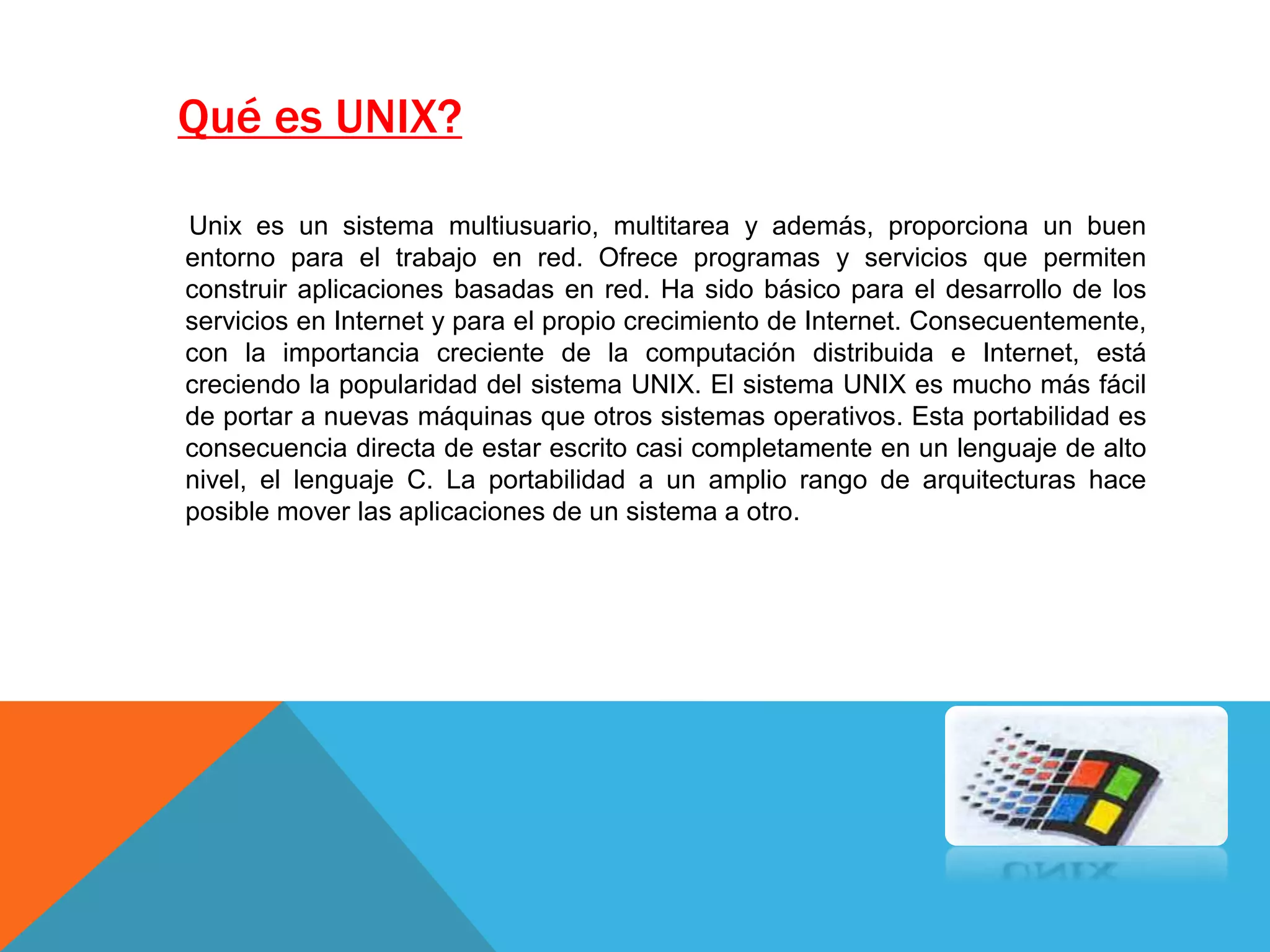 Este documento describe la historia y características de Unix, Linux y sus sistemas operativos. Explica que Unix se originó en los años 1960 y ha sido fundamental para el desarrollo de Internet, mientras que Linux fue creado en 1991 por Linus Torvalds y es un sistema operativo de código abierto basado en Unix. También resume las principales características de Unix como su portabilidad y de Linux como su capacidad multitarea, multiusuario e interconectividad.