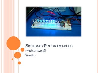 El documento describe el diseño y construcción de un vúmetro, un dispositivo que muestra el nivel de señal en unidades de volumen. El vúmetro usa un potenciómetro de 10KΩ, resistencias de 1KΩ y 10KΩ, LEDs y un circuito LM3915N para comparar un voltaje de entrada con un valor de referencia y visualizar el nivel. El reporte de la práctica incluirá una portada, objetivos, tabla de materiales, diagrama del circuito, procedimiento y conclusiones.