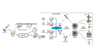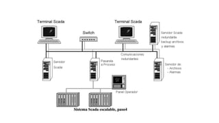 Este documento describe los sistemas SCADA, incluyendo su historia, arquitectura, componentes y funcionalidades. Explica que un SCADA es un software que permite el acceso remoto y control de datos de procesos industriales a través de herramientas de comunicación. Describe los componentes clave de un SCADA como las unidades terminales remotas, unidades maestras terminales y software SCADA y sus funciones como pantallas, tendencias y alarmas.
