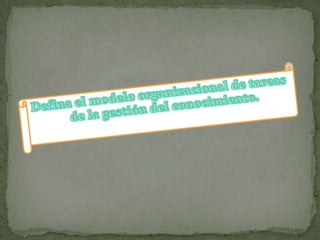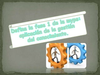 Este documento describe una metodología de 5 fases para la gestión del conocimiento y la toma de decisiones estratégicas, tácticas y operacionales. La metodología incluye fases para la gestión del conocimiento, el nivel estratégico, el nivel táctico, el nivel operacional y los indicadores de medición. También describe seis modelos clave: la organización, las tareas, los agentes, el conocimiento, la comunicación y el diseño.