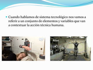 El documento describe los sistemas tecnológicos, incluyendo mecánicos, eléctricos, hidráulicos, neumáticos y de telecomunicaciones. Cada sistema tiene funciones específicas, como transformar o transmitir energía y controlar flujos de fluidos. Se mencionan ejemplos de sistemas tecnológicos comunes en el hogar, como la cochera y el sistema de alcantarillado.