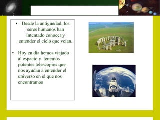 El documento describe el universo y el sistema solar, comenzando con la historia de la humanidad en su intento de comprender el cielo. Detalla el origen del universo a través del Big Bang, la formación de galaxias, y específicamente, la Vía Láctea. También se aborda la estructura del sistema solar, que incluye el sol, planetas, satélites, asteroides y cometas.