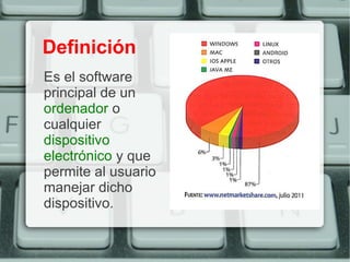 Los sistemas operativos son el software principal que permite al usuario controlar un dispositivo electrónico mediante la gestión de los recursos hardware y software. Los sistemas operativos más utilizados son Windows, iOS, Android y varias distribuciones de Linux. Cumplen funciones como la gestión de recursos, presentar la interfaz de usuario y administrar archivos y tareas.