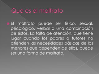 El documento describe los diferentes tipos de maltrato infantil, incluyendo el maltrato físico, sexual, psicológico y por negligencia. El maltrato físico incluye cualquier acción que cause daño o dolor al cuerpo de un menor. El maltrato sexual se refiere a cualquier contacto sexual inapropiado con un menor. El maltrato psicológico puede incluir la falta de atención a las necesidades básicas de un niño.