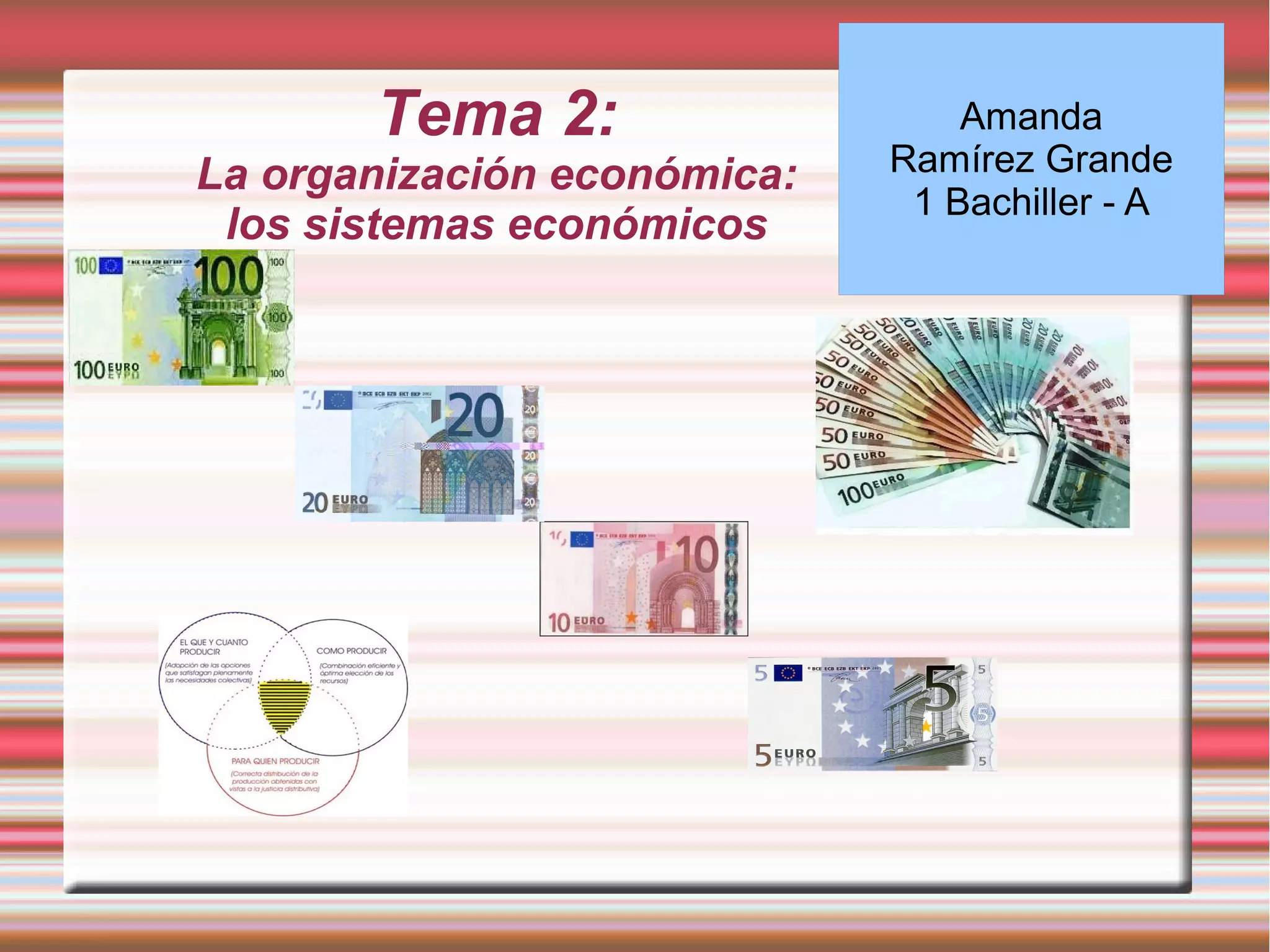 Este documento presenta tres sistemas económicos principales: el capitalismo, basado en el libre mercado y la propiedad privada; el comunismo, con una economía planificada centralmente por el estado; y el intervencionismo, donde el estado interviene para corregir los fallos del mercado en una economía mixta. Explica los fundadores y características clave de cada sistema.
