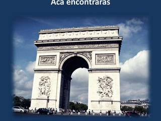 El documento describe el Arco del Triunfo en París a través de varios pasos. Primero, proporciona información básica sobre su ubicación, dimensiones, arquitecto y significado histórico. Luego analiza los elementos formales del diseño como punto, línea, forma y color. Finalmente, examina aspectos como equilibrio, tensión, simetría y significado semiótico para conmemorar las victorias militares francesas.