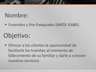 El documento describe un sitio web para una funeraria llamada Funerales y Pre-Exequiales SANTA ISABEL. El objetivo del sitio es ofrecer a los clientes la capacidad de facilitar los trámites de fallecimiento de un familiar y dar a conocer los servicios de la funeraria. El sitio está dirigido a personas dentro y fuera del país que busquen servicios funerarios para un familiar o que deseen afiliarse a planes pre-exequiales. El documento también menciona algunos competidores y presenta bocetos iniciales