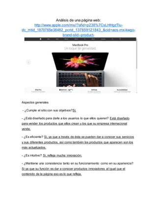 Este documento presenta un análisis semiótico de la página web de Apple México realizado por dos estudiantes. El análisis evalúa aspectos como el branding, la navegación, las imágenes, los contenidos, la tecnología y la interfaz de la página para determinar si cumple con sus objetivos de manera eficiente e intuitiva para los usuarios. En general, concluye que la página logra presentar de manera coherente los productos de Apple y facilitar su comprensión y navegación.
