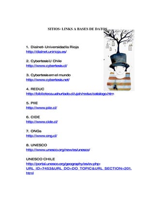 Este documento proporciona una lista de 25 enlaces a sitios web que contienen bases de datos y recursos de información útiles para la investigación. Algunos de los sitios destacados incluyen bases de datos de tesis universitarias de Chile y el mundo, bibliotecas digitales de la UNESCO, UNICEF y otras organizaciones, así como enlaces a bibliotecas universitarias chilenas y recursos sobre escritura y publicación académica.