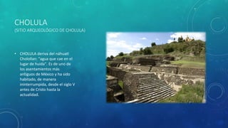 Cholula fue uno de los primeros asentamientos humanos en México y contiene la Gran Pirámide de Cholula, la segunda pirámide más grande del mundo. El museo de Cholula exhibe más de 200 artefactos arqueológicos que muestran la historia de la alfarería y la cultura. Cantona fue un gran asentamiento entre los años 600-1000 d.C. con patios y estructuras que sugieren una división del trabajo. Tepexi el Viejo fue el centro de un importante señorío durante el periodo Postclásico