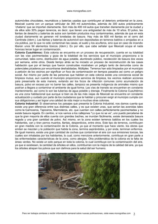 El documento analiza la contaminación ambiental en la zona urbana de Mexicali, Baja California. Describe que la ciudad sufre problemas de contaminación debido al crecimiento acelerado y falta de infraestructura. Realizó encuestas en 4 colonias y encontró que la Colonia Baja California es la más contaminada, con calles sin pavimentar, basura y desechos tóxicos. Propone soluciones como más áreas verdes y concientización pública para reducir la contaminación y sus efectos en la salud.