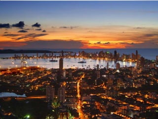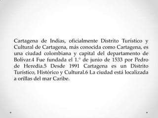 Este documento presenta 10 de los principales sitios turísticos de Cartagena, Colombia. Cartagena es una ciudad histórica fundada en 1533, localizada en la costa del mar Caribe, y es uno de los destinos turísticos más importantes de Colombia. Los 10 sitios incluyen lugares como la Plaza de los Zapatos Viejos, el Museo del Oro, el Castillo de San Felipe, el Teatro de Cartagena, la Iglesia de San Pedro Claver, y el Cerro de la Popa.
