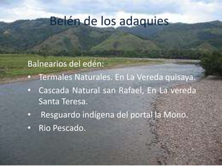 El documento presenta varios sitios turísticos del departamento de Caquetá, Colombia. Incluye la laguna Chairá, conocida por sus orquídeas y lotos; la Isla del Amor en el río Caguán, con áreas deportivas y restaurantes; y el Parque Nacional Natural de Los Picachos entre Meta y Caquetá, hogar de diversas especies de plantas y animales.