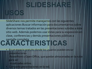 SlideShare permite a los usuarios subir presentaciones PowerPoint u Open Office para que puedan ser vistas en línea. Las presentaciones pueden ser buscadas para documentarse sobre diversos temas o utilizarse para exposiciones públicas. Los wikis permiten la creación colaborativa de documentos en línea mediante un lenguaje de marcas sencillo, mientras que los blogs permiten a los usuarios publicar contenido y comentarios.