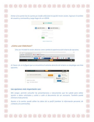 Slideshare es un sitio web para compartir presentaciones y documentos. Los usuarios pueden crear una cuenta, cargar archivos públicos o privados y proporcionar comentarios. Para cargar un archivo, los usuarios deben iniciar sesión, seleccionar "Cargar", elegir el archivo y agregar un título y descripción. Una vez cargado, el archivo estará disponible para que otros usuarios lo vean.