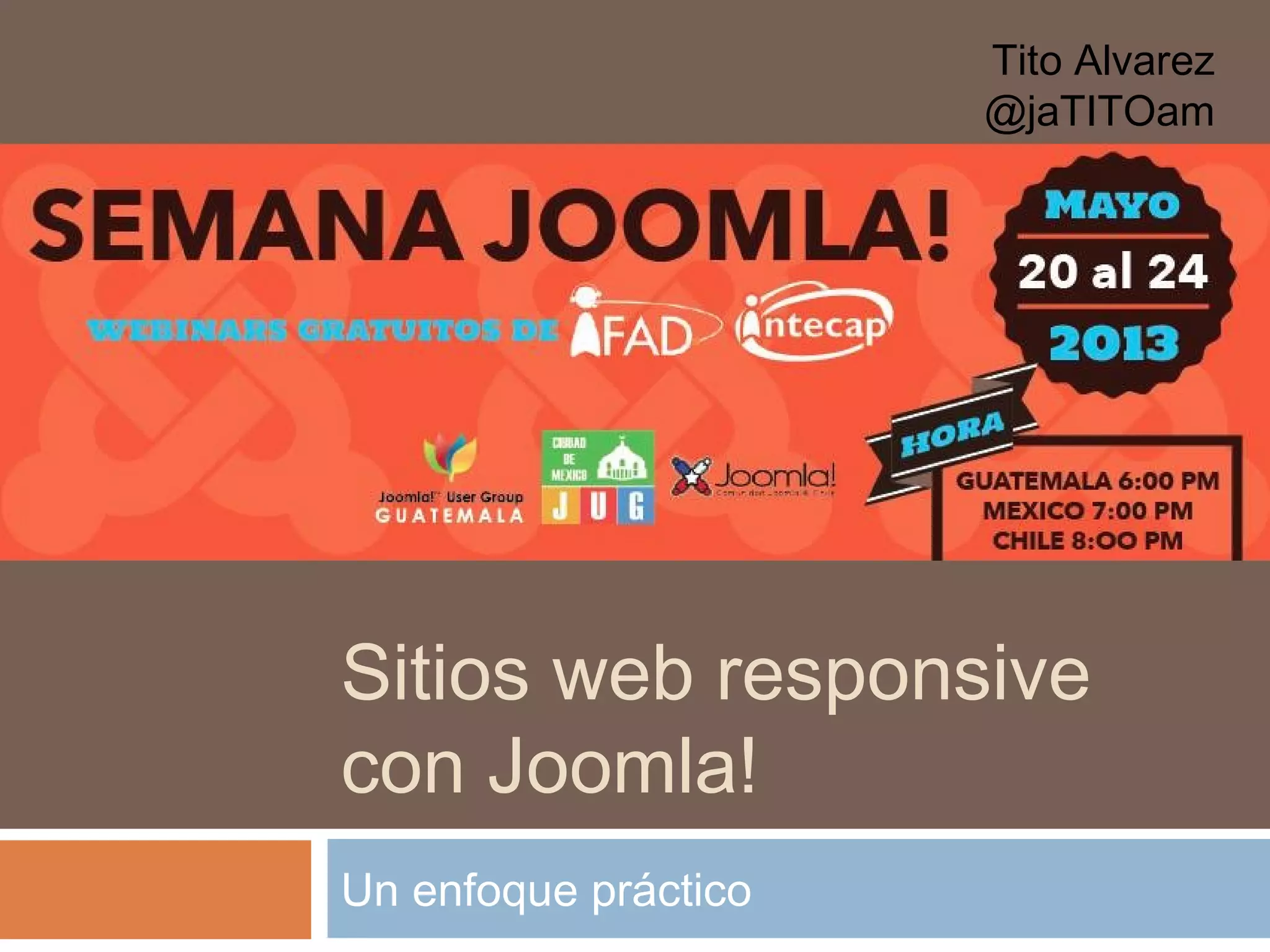 El documento aborda el desarrollo de sitios web responsive utilizando Joomla!, destacando la incorporación de Bootstrap en Joomla 3 para facilitar el diseño adaptable. Se presentan conceptos clave del responsive web design, como el uso de planos responsive, la ocultación de información y la consideración del tamaño de los dedos al diseñar para dispositivos móviles. Además, se mencionan diversas plantillas y frameworks que permiten lograr un diseño responsive efectivo en Joomla.