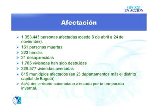 La temporada invernal en Colombia está afectando a más de 1,3 millones de personas en 28 departamentos. Los departamentos más afectados son Bolívar, Magdalena, Sucre y Chocó. Se necesita asistencia en alimentación, agua, protección, albergues, educación y salud. La OPS/OMS está apoyando la respuesta en salud, agua y saneamiento a través de la movilización de recursos y asistencia técnica a las autoridades locales.