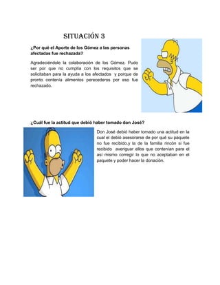 Don José debió haber tomado una actitud más colaborativa para averiguar por qué su paquete de ayuda a los afectados fue rechazado, mientras que el paquete de otra familia fue aceptado. Debió comunicarse con los responsables para entender los requisitos y corregir cualquier problema con su donación para poder ayudar a las personas necesitadas.