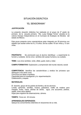 Este documento describe una actividad didáctica realizada con estudiantes de 4to grado sobre los cinco sentidos. La actividad tuvo como objetivo que los estudiantes identificaran y experimentaran la función y cuidado de los sentidos a través de ejercicios prácticos con la participación de los padres. Los estudiantes trabajaron en equipos y de forma colaborativa realizando ejercicios con venda en los ojos para identificar objetos mediante el tacto, olfato y oído. Al final evaluaron lo aprendido y compartieron comentarios sobre la