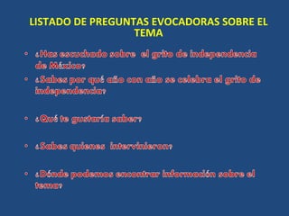 El documento propone una situación problema sobre el inicio del movimiento de independencia de México. Presenta conceptos clave como Miguel Hidalgo y Costilla, la conspiración y el Grito de Independencia. Divide a los estudiantes en equipos para investigar el tema, exponerlo, escenificar momentos relevantes e interpretar personajes históricos. También incluye tareas individuales como hacer una historieta sobre el Grito de Independencia.