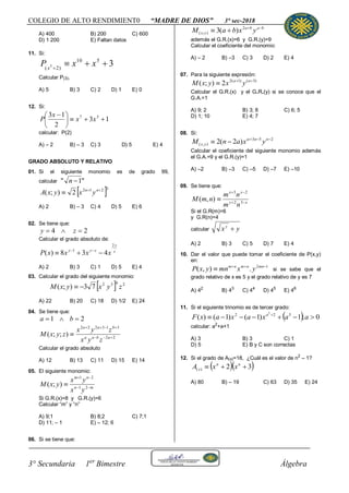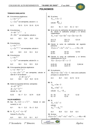 Este documento contiene 12 ejercicios de álgebra sobre polinomios, términos semejantes, valor numérico de polinomios, grado absoluto y relativo. Los ejercicios incluyen calcular valores, sumas de coeficientes y términos independientes de polinomios dados sus expresiones.