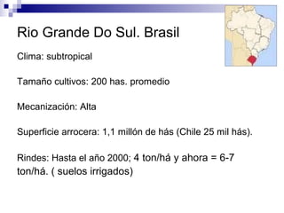 El documento describe las prácticas de cultivo de arroz en Brasil y Uruguay, incluyendo la preparación del suelo, siembra, manejo del agua y cosecha. En Brasil, los rendimientos han aumentado de 4 a 6-7 toneladas por hectárea debido a la mecanización, transferencia de tecnología y manejo integrado del cultivo. En Uruguay, el área de cultivo y rendimientos han aumentado constantemente desde 1933, y la mayoría de los productores arriendan la tierra y usan riego privado.