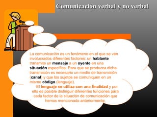 El documento describe los diferentes factores que influyen en la comunicación, incluyendo elementos verbales y no verbales. Explica que la comunicación implica un emisor, receptor, mensaje y código dentro de una situación específica, y que el lenguaje cumple funciones como referencial, fática, metalingüística y apelativa. También describe elementos paralingüísticos como la entonación y pausas que acompañan el lenguaje verbal, y la comunicación no verbal a través de expresiones faciales, gestos y distancia entre interlocutores.