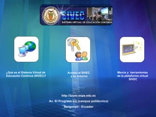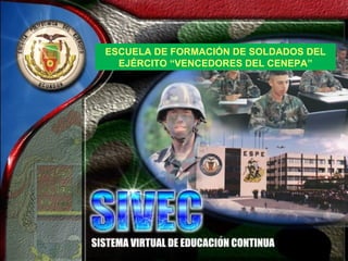 El documento describe el Sistema Virtual de Educación Continua (SIVEC) del Ejército Ecuatoriano. El SIVEC es una plataforma educativa virtual que permite la interacción entre estudiantes, profesores e instituciones a través de servicios como mensajería, foros, videoconferencias y calificaciones. Se proveen instrucciones para acceder a la plataforma y familiarizarse con sus menús y herramientas.