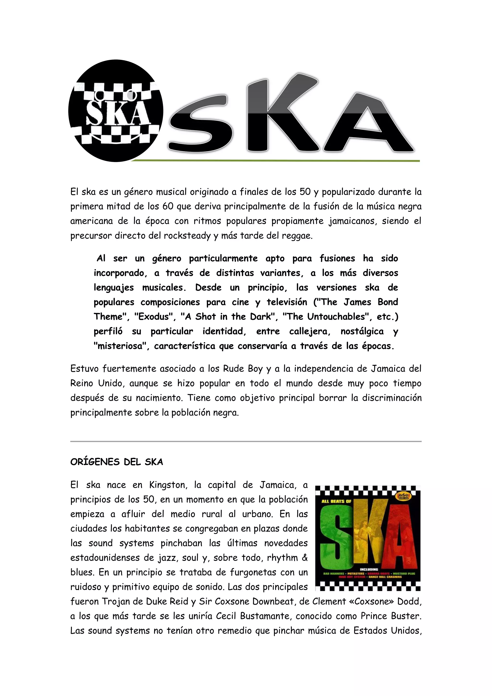 El ska se originó a finales de los 50 en Kingston, Jamaica, como una fusión de la música negra estadounidense con ritmos jamaicanos. Se hizo popular como música callejera y nacionalista que reflejaba la identidad de los rude boys y la lucha por la independencia de Jamaica. Aunque comenzó localmente, el ska se extendió rápidamente por todo el mundo y ha influido en muchos géneros musicales desde entonces.