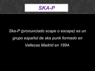 Este documento proporciona información sobre la banda de ska punk española Ska-P. Se formó en 1994 en Madrid y ha lanzado varios álbumes entre 1994 y 2008. Sus canciones se caracterizan por letras críticas del capitalismo, fascismo, racismo e imperialismo. La banda ha realizado giras internacionales por Europa y América.