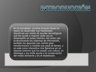 Este documento presenta un curso virtual sobre skateboarding con el fin de aprovechar los recursos tecnológicos para fomentar este deporte entre los jóvenes. El curso busca enseñar sobre la historia, reglas y trucos básicos de skateboarding para promover una actividad saludable, divertida y amigable con el medio ambiente.