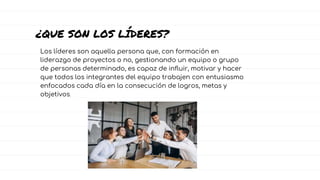 El documento describe los diferentes tipos de liderazgo, incluyendo el autoritario, participativo, que delega, estilo coaching, visionario y que marca el paso. Explica que los líderes son aquellos que influyen y motivan a un equipo para lograr metas y objetivos, y que el liderazgo es importante para el éxito de cualquier organización al proveer guía y dirección.
