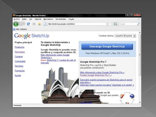 Sketchup es un programa de diseño y modelado 3D desarrollado por Google que permite conceptualizar y crear rápidamente formas arquitectónicas en 3D, geo-referenciar los edificios creados sobre imágenes de Google Earth, y compartir los modelos en línea. El programa se puede descargar e instalar fácilmente desde la página web de Google.